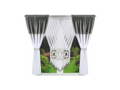 Šíře záclony je 590 cm a výška 250 cm (tolerance + /- 5 cm). Hodí se na tyč o šířce 200 - 300 cm. Rozměry závěsů - 145x250 cm (2 ks)Rozměry záclony - 300x250 cm...
