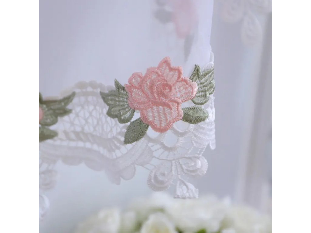 Hotová kusová záclona z hladkého průsvitného bílého voálu je ozdobená krásnou krajkou. Nahoře je opatřena řasící stuhou díky které můžete měnit šířku záclony a tunýlkem na tyč o průměru 3,5 cm.