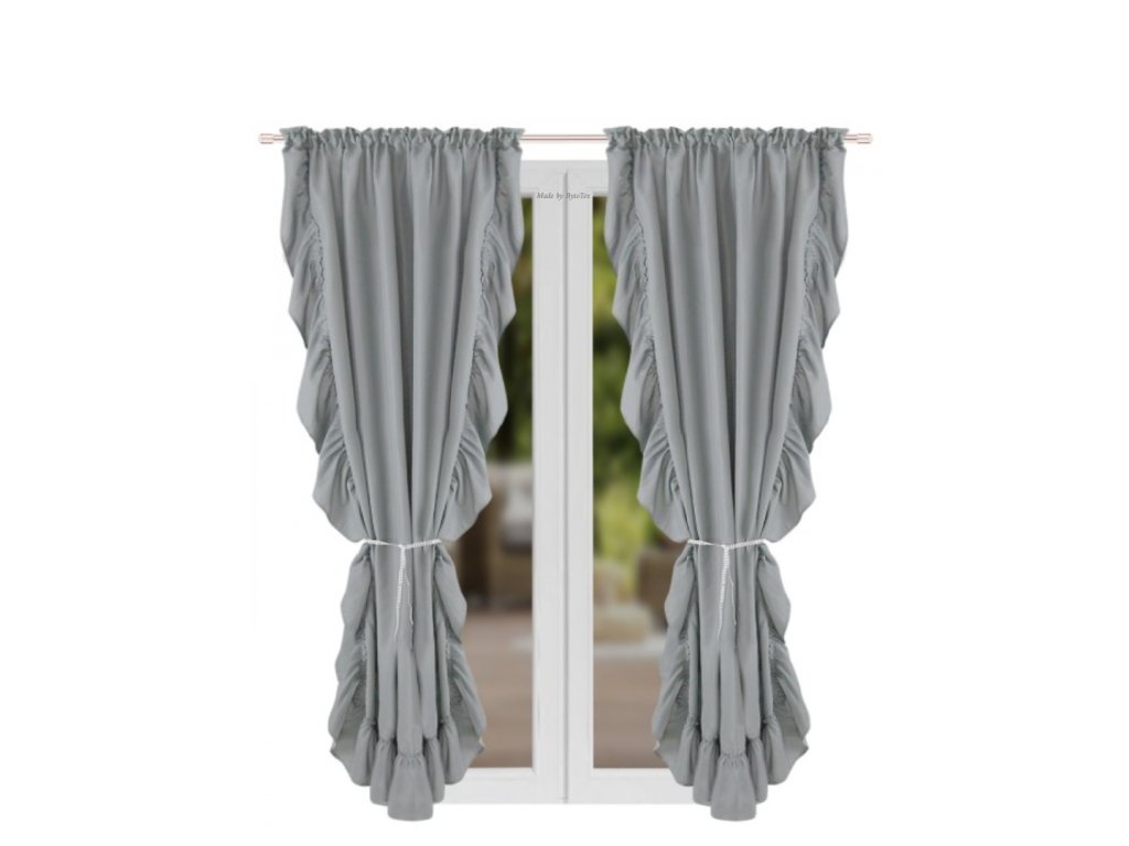 Hlavním dekorativním prvkem záclony je drapérie, která ji dodává jedinečný charakter. Záclona je obšita nabírací páskou, což umožňuje jeji snadné zavěšení na různé typy záclonových tyčí a přizpůsobení individuálním preferencím a designu interiéru. Sada obsahuje dvě tenké stuhy s kamínky, které umožňují připevnit záclony do kokonů.