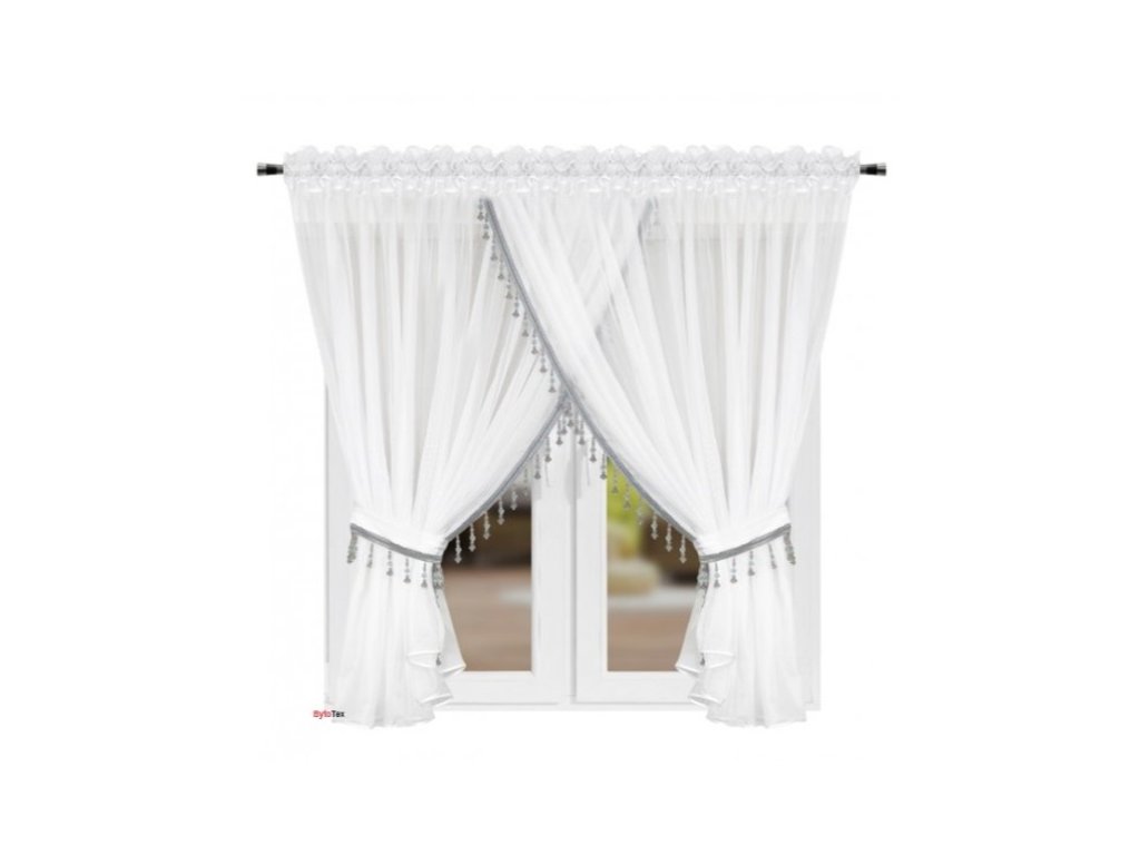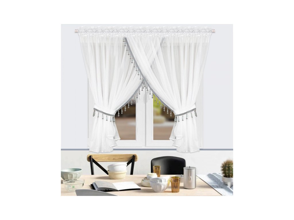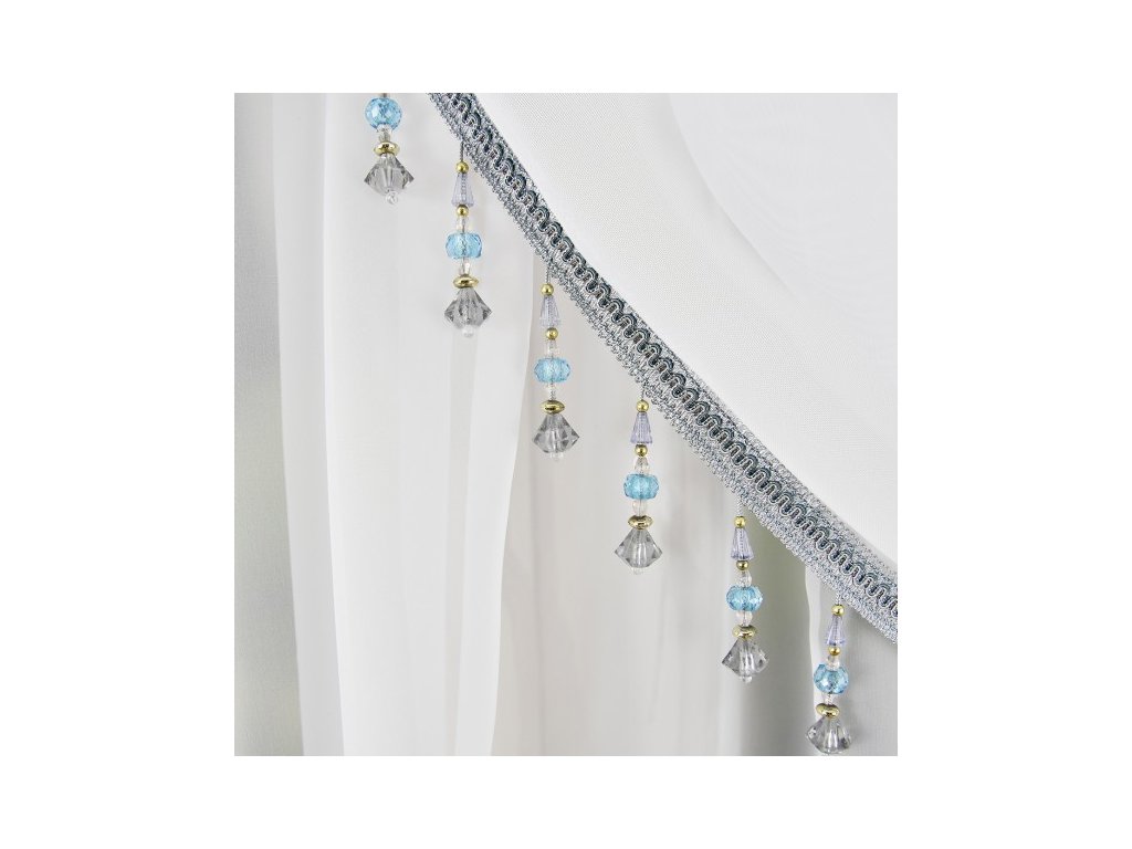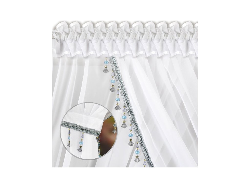 Stylová a elegantní záclona Lapelia z voálu je ideální pro okna v obývacím pokoji, jídelně, kuchyni atd. Kombinuje klasickou bílou záclonu s moderními korálky, což dodává zajímavý vzhled. Hodí se do klasických i moderních interiérů. Lze ji pověsit na garnýži jak na běžné dny, tak i na výjimečné události. Zdobí ji korálky a zirkony, které krásně odrážejí světlo. Záclona Lapelia má rozměr 400 × 155 cm a je připravena k okamžitému zavěšení. Nahoře je opatřena řasící stuhou díky které můžete měnit šířku záclony a tunýlkem na tyč o průměru 3,5 cm. Je též přizpůsobena k pověšení na háčky nebo žabky.