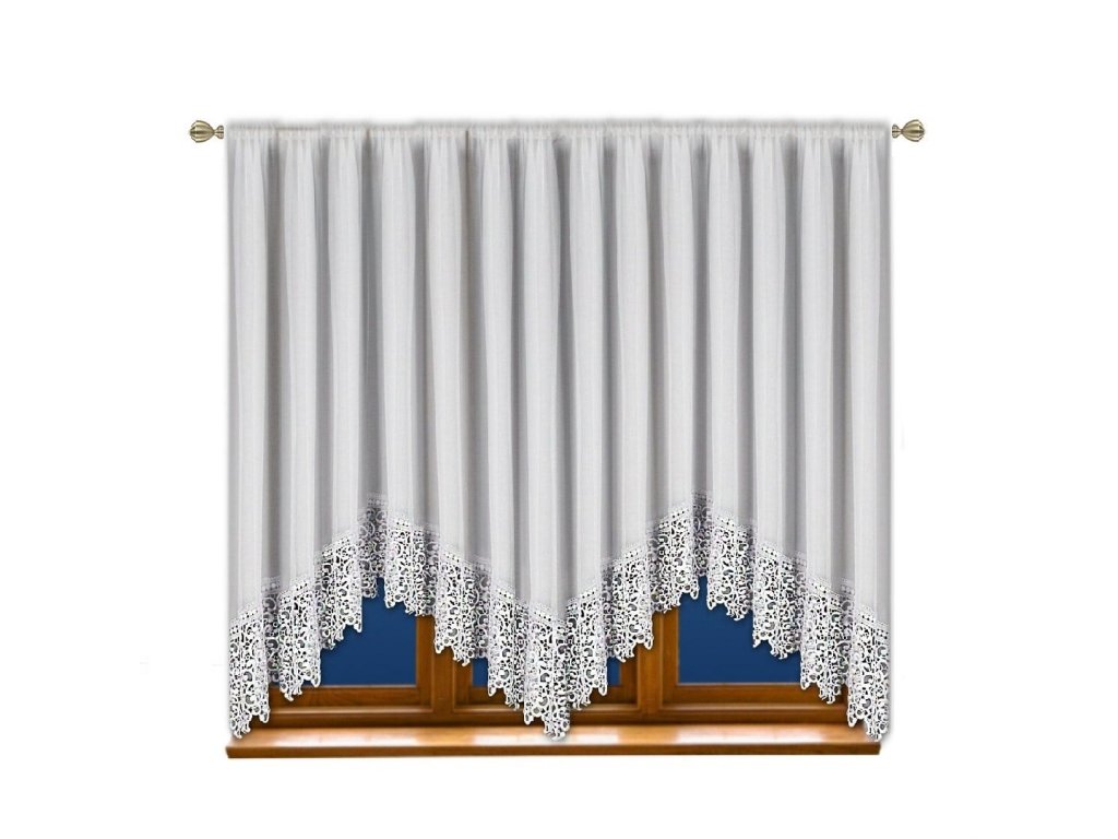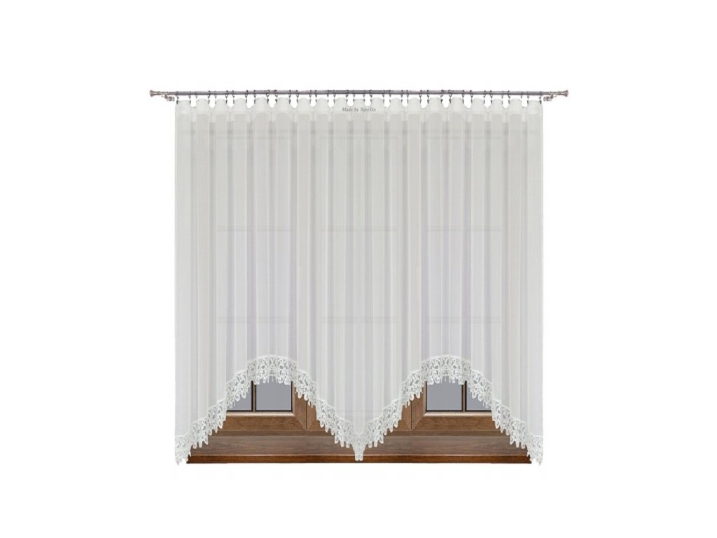 Hotová kusová záclona z hladkého průsvitného bílého voálu je ozdobená krásnou krajkou (13 cm). Nahoře je opatřena řasící stuhou díky které můžete měnit šířku záclony a tunýlkem na tyč o průměru 3,5 cm. Je též přizpůsobena k pověšení na háčky nebo žabky.