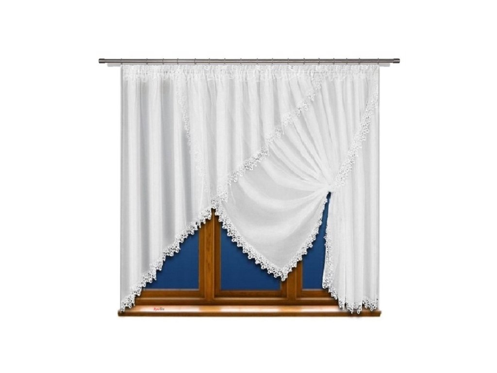 Hotová kusová záclona z hladkého průsvitného bílého voálu je ozdobená krásnou krajkou. Skládá se ze dvou dílů které jsou ušité na jedné řasící pásce, pomocí které můžete upravovat šířku záclony. Je přizpůsobena k pověšení na háčky, žabky nebo týč o průměru 3,5 cm. Dá se nařasit.