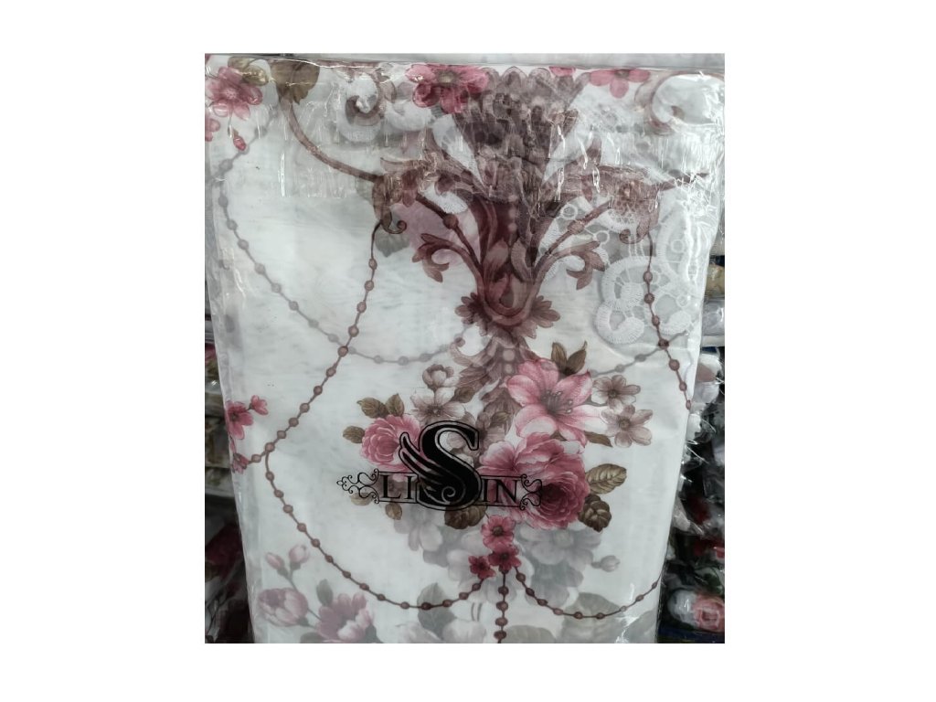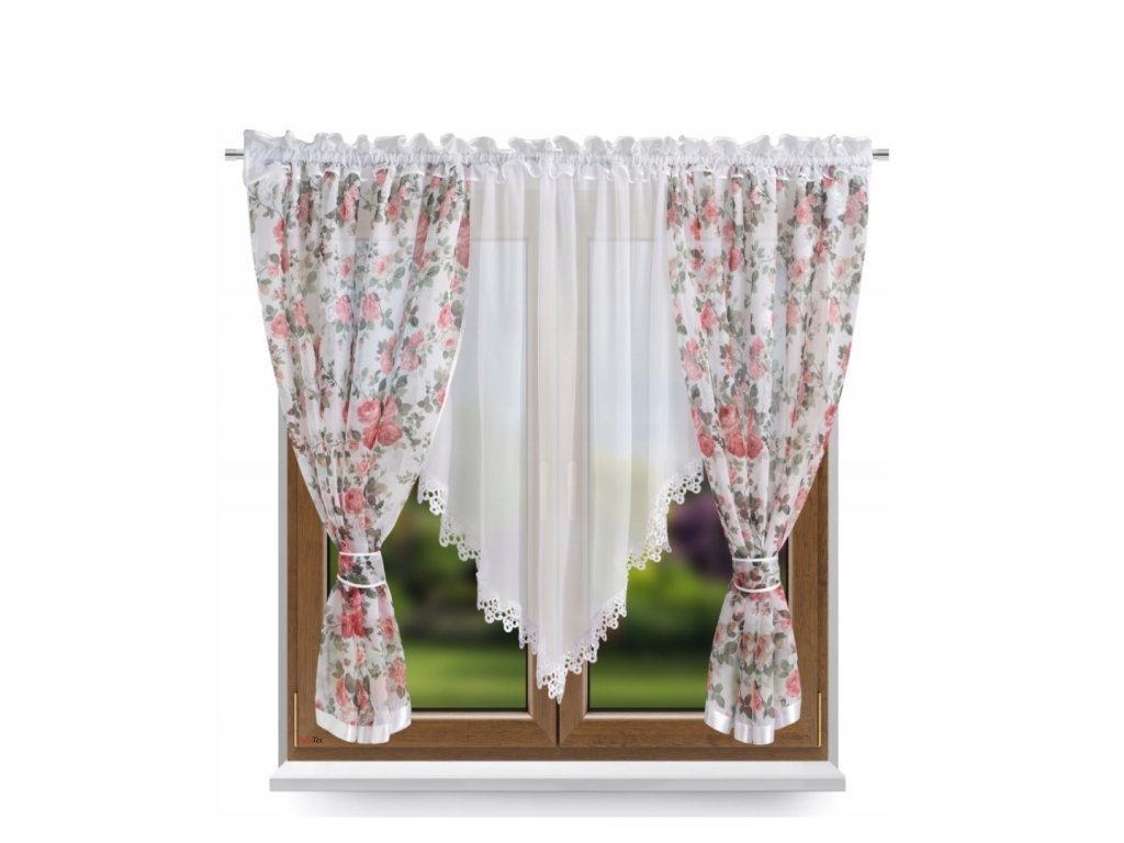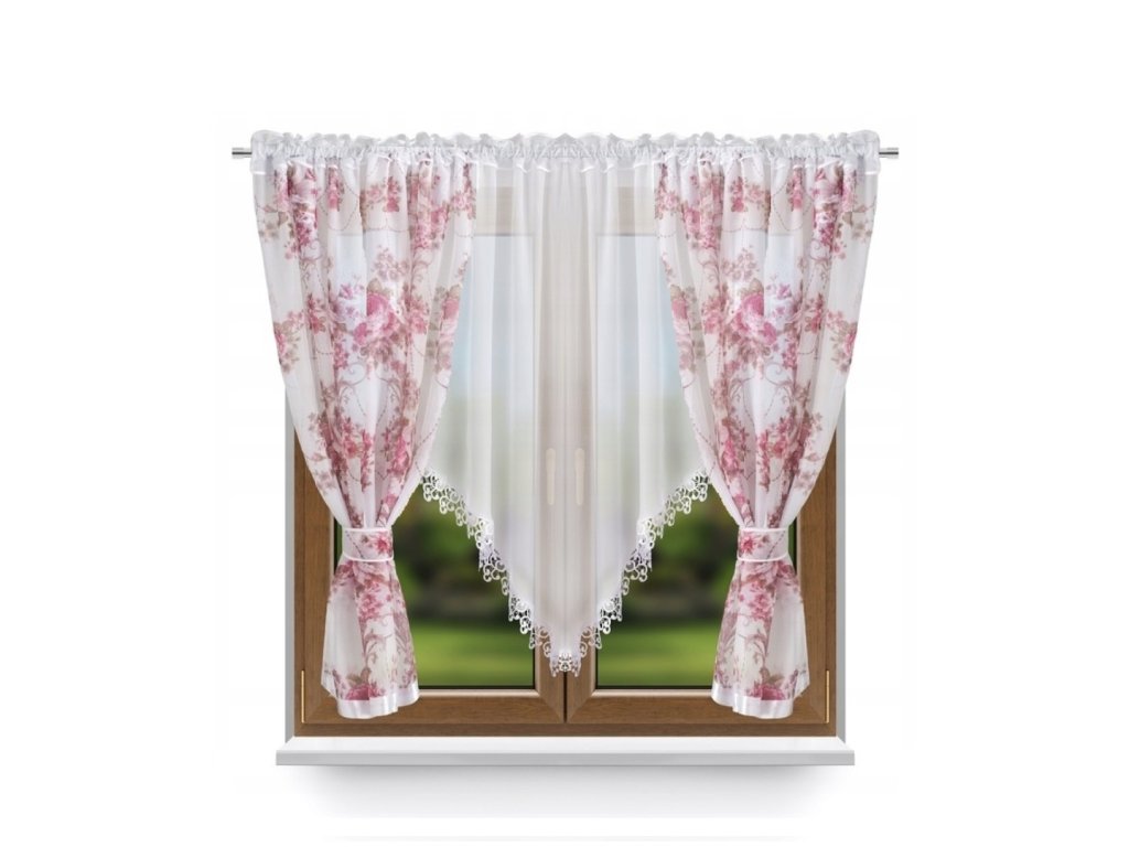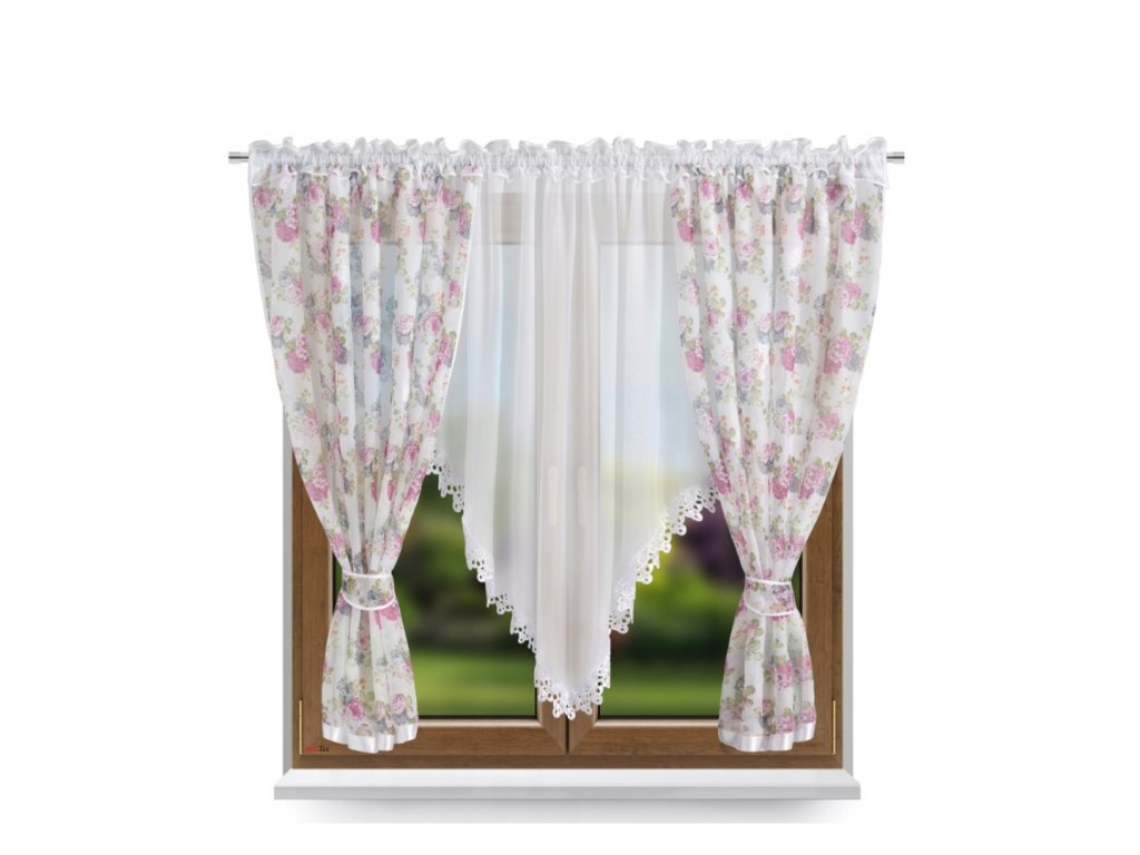 Nádherná hotová kusová záclona s květinamy. Záclona je po okraji ozdobená lesklou lemovkou. Na horním okraji je našitá řasící pásce, pomocí které můžete upravovat šířku záclony a tunýlkem na tyč o průměru 3,5 cm.