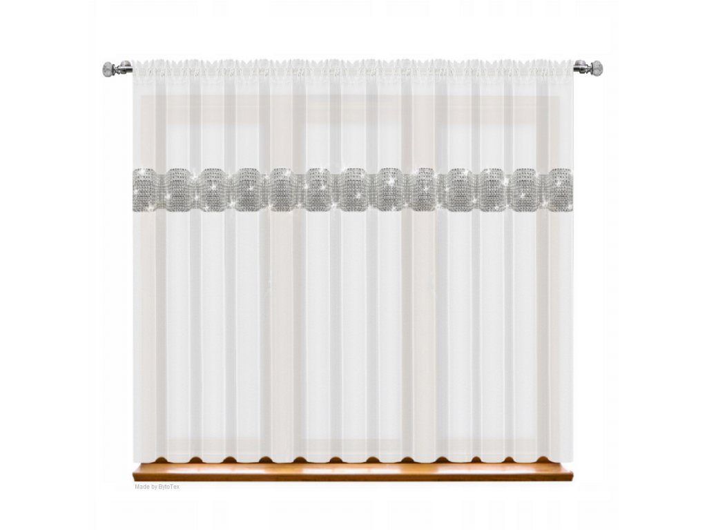 Hotová kusová záclona z hladkého průsvitného bílého voálu. Záclona je zdobená krásnýmí imitovanými zirkony 12 cm. Nahoře je opatřena řasící stuhou díky které můžete měnit šířku záclony a tunýlkem na tyč o průměru 3,5 cm. Je též přizpůsobena k pověšení na háčky nebo žabky. Dá se nařasit.