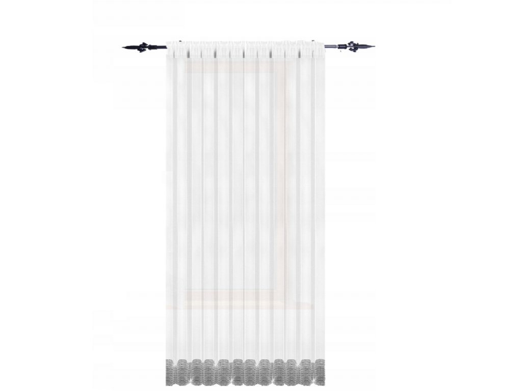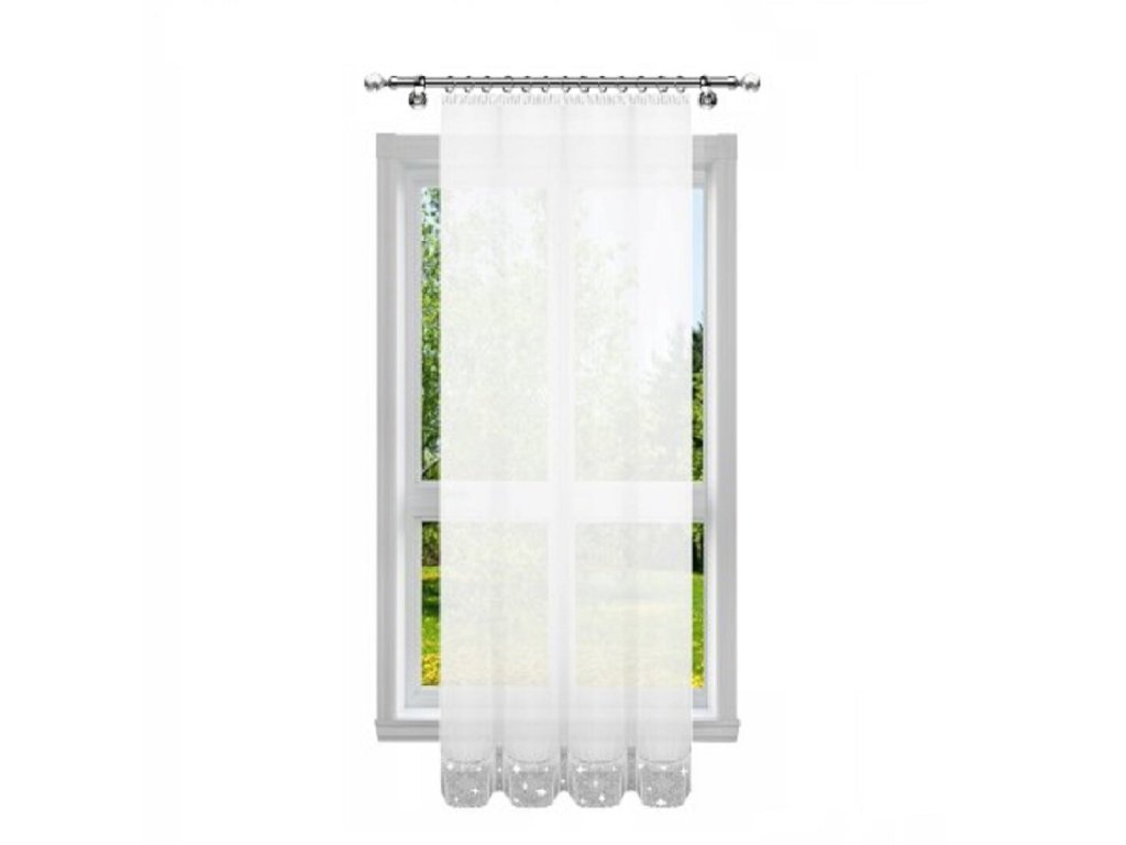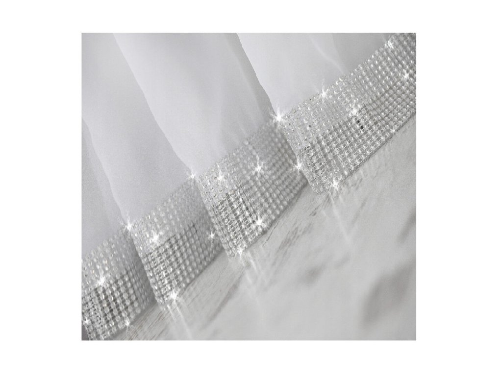 Hotová kusová záclona z hladkého průsvitného bílého voálu. Záclona je zdobená ve spodní části krásnými imitovanými zirkony 6 cm. Nahoře je opatřena řasící stuhou díky které můžete měnit šířku záclony a tunýlkem na tyč o průměru 3,5 cm. Je též přizpůsobena k pověšení na háčky nebo žabky.