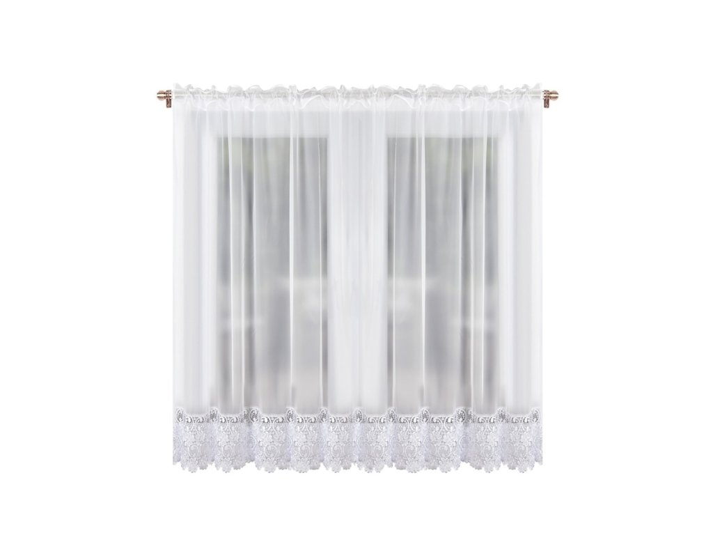 Hotová kusová záclona z hladkého průsvitného bílého voálu je ozdobená krásnou krajkou (28 cm). Nahoře je opatřena řasící stuhou díky které můžete měnit šířku záclony a tunýlkem na tyč o průměru 3,5 cm.