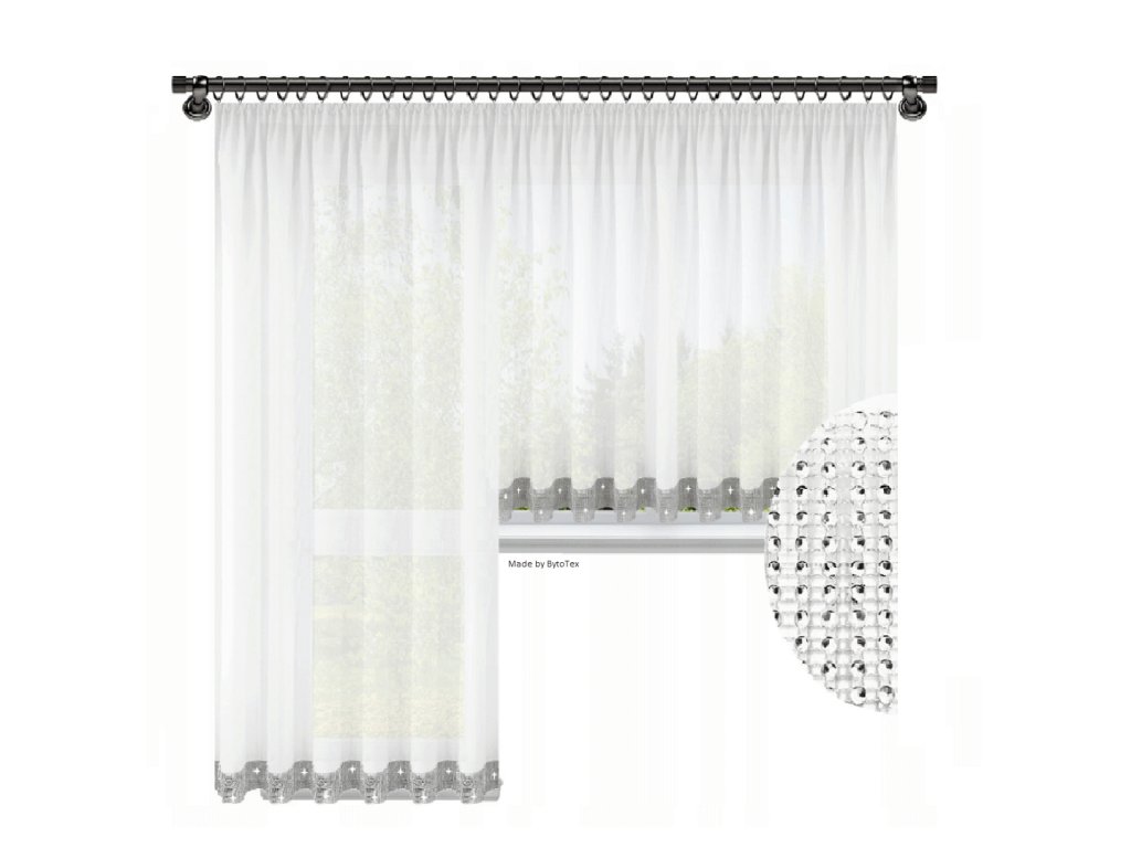 Originální a elegantní záclona z vysoce kvalitního bílého voálu. Spodní část je bohatě zdobená zirkonovou páskou širokou 6 cm.