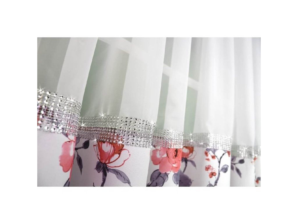 Hotová kusová záclona z hladkého průsvitného bílého voálu s krásným a kvalitním saténovým zdobením. Nahoře je opatřena řasící stuhou díky které můžete měnit šířku záclony a tunýlkem na tyč o průměru 3,5 cm. Nahoře a dole jsou dekorativní polyesterové materiály a uprostřed je hladký voál.