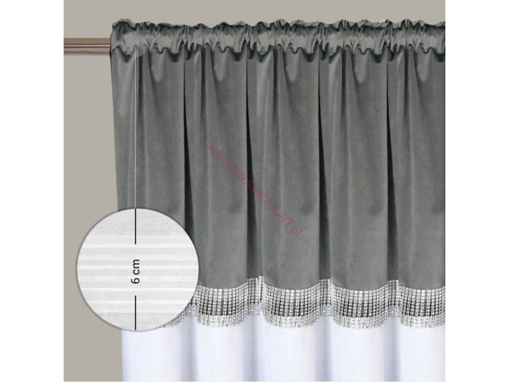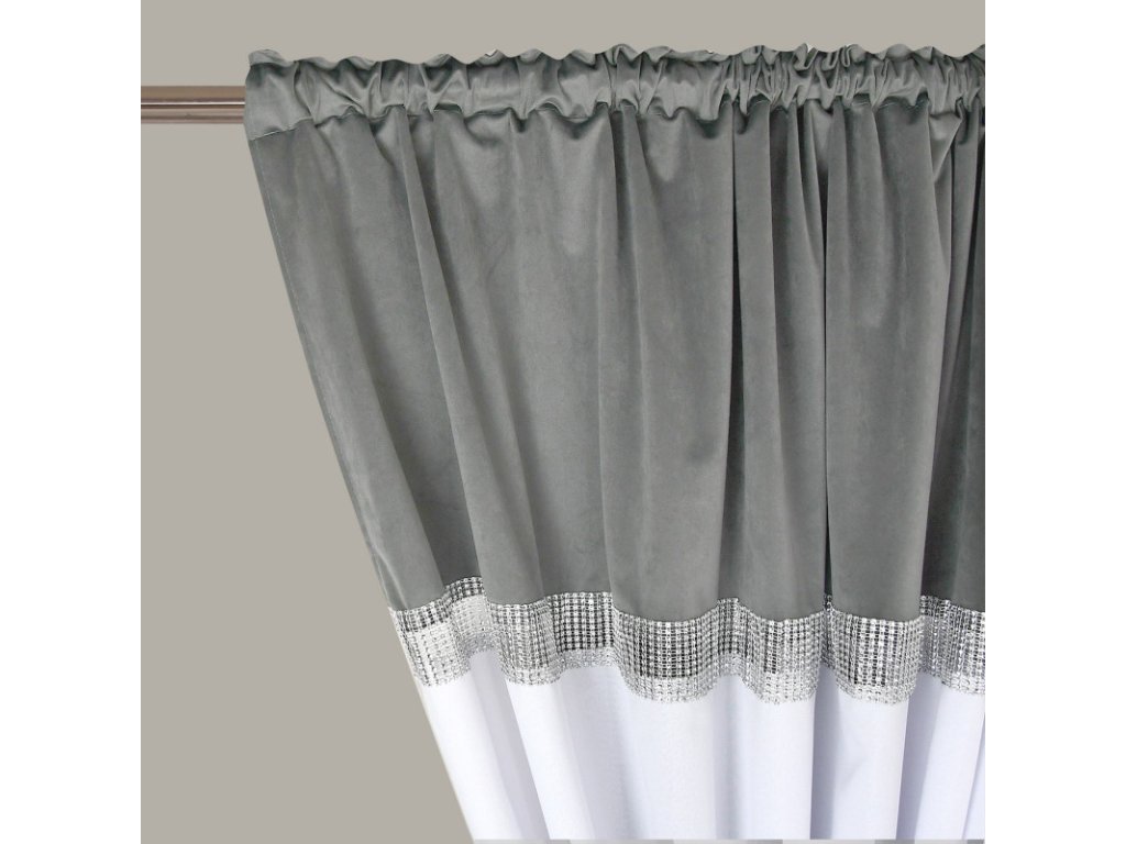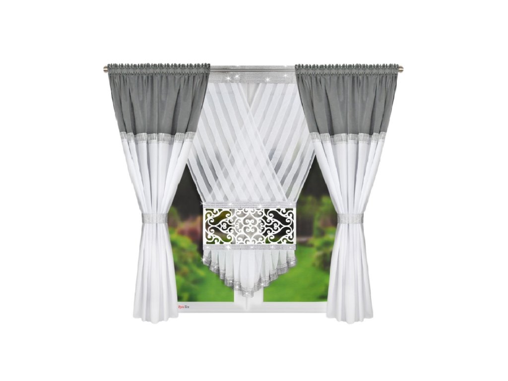 Sada závěsů s panelem Dezzi je nejen zajímavou barevnou kombinací. Zde máme černou látku s květinovým vzorem, která zdůrazňuje jedinečný vzhled záclon. V horní části závěsu je vložka z černé látky, zdobená kubickou zirkonií. Taková vložka dělá jednoduchou sadu závěsů modernější a dokonce i trochu extravagantní. Celá sada na pásce má rozměr 410 × 160 cm a lze ji zavěsit na různé typy záclonové tyče.Sada obsahuje dva závěsy a jeden panel pro úhledný celek.