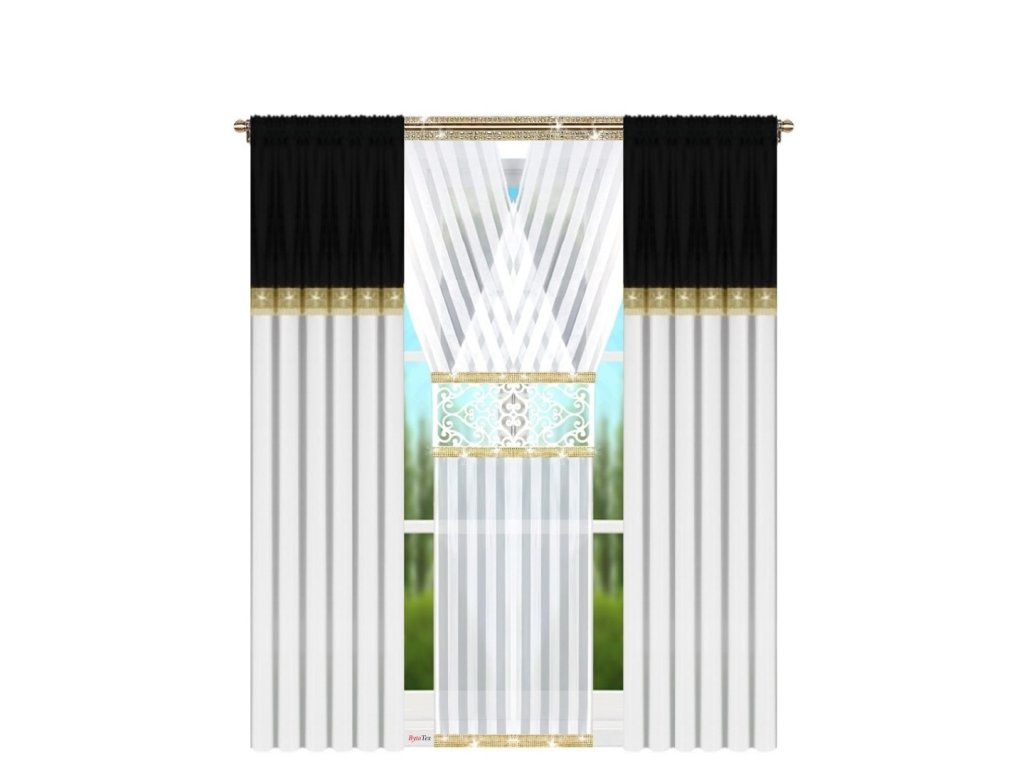 Sada závěsů s panelem Dezzi je nejen zajímavou barevnou kombinací. Zde máme černou látku s květinovým vzorem, která zdůrazňuje jedinečný vzhled záclon. V horní části závěsu je vložka z černé látky, zdobená kubickou zirkonií. Taková vložka dělá jednoduchou sadu závěsů modernější a dokonce i trochu extravagantní. Celá sada na pásce má rozměr 410 × 250 cm a lze ji zavěsit na různé typy záclonové tyče. Rozměry panelu jsou 120 × 250 cm a na jeden závěs: 145 × 250 cm. Sada obsahuje dva závěsy a jeden panel pro úhledný celek.