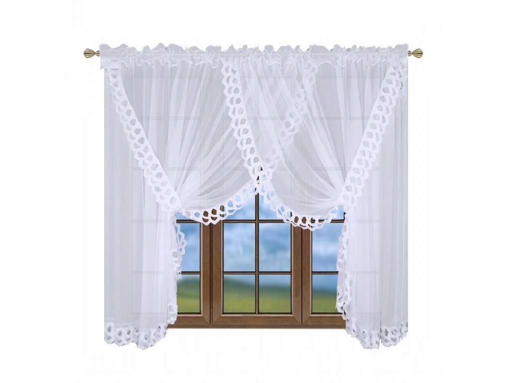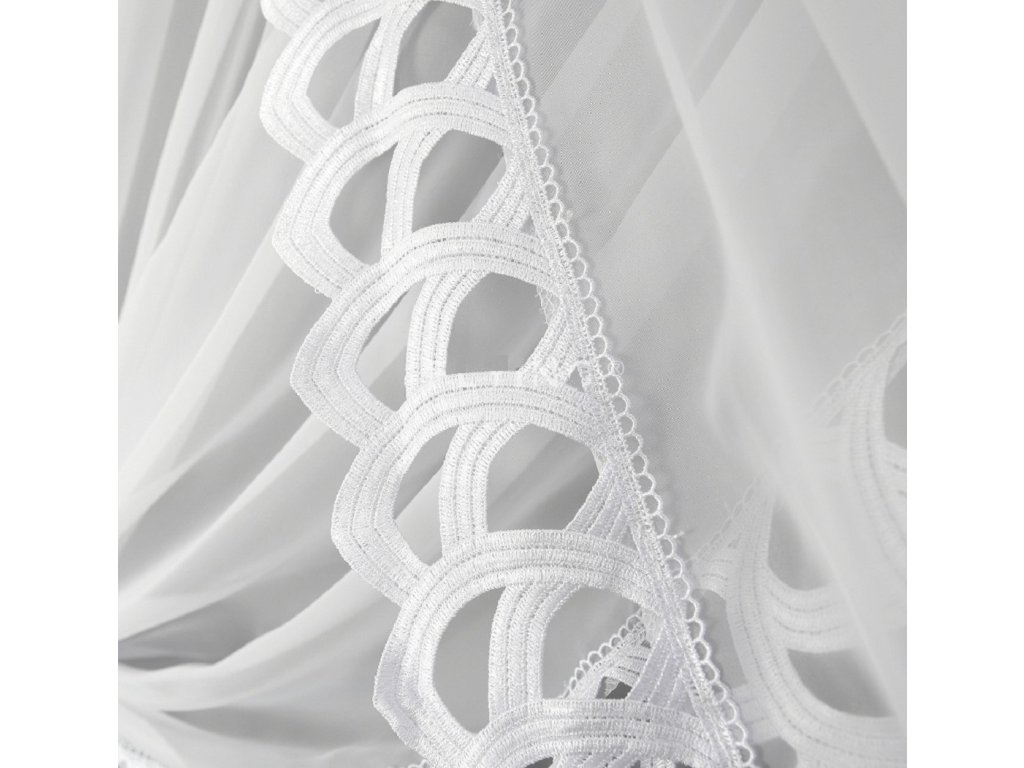 Hotová kusová záclona z hladkého průsvitného bílého voálu je ozdobená krásnou krajkou (15 cm). Nahoře je opatřena řasící stuhou díky které můžete měnit šířku záclony a tunýlkem na tyč o průměru 3,5 cm. Je též přizpůsobena k pověšení na háčky nebo žabky.