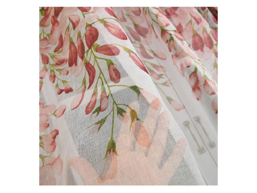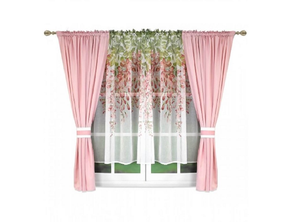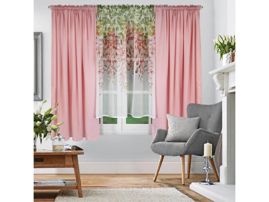 Sada hotových záclon Denisa. Skládá se ze třech dílů které jsou ušité na jedné řasící pásce, pomocí které můžete upravovat šířku záclony. Střední díl je průsvitný s květinovým vzorem v tlumených barvách. Záclona je vhodná do každého interiéru ale obzvláště do kuchyně.