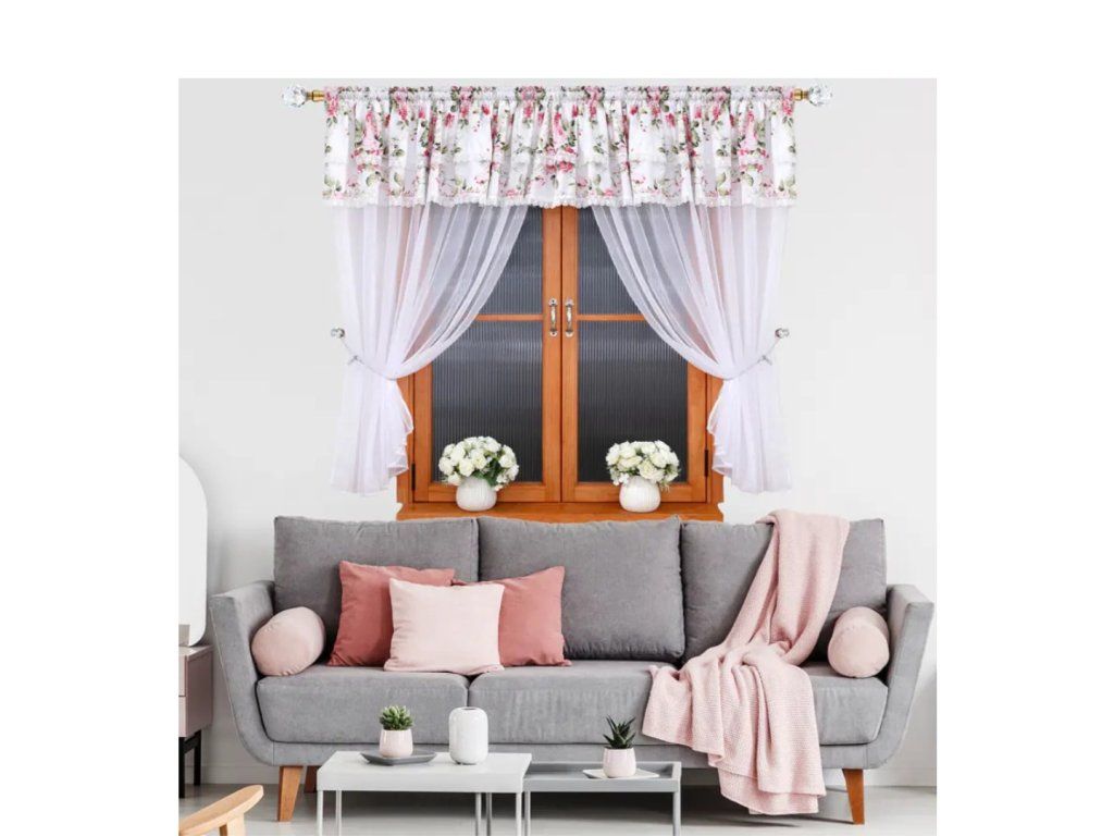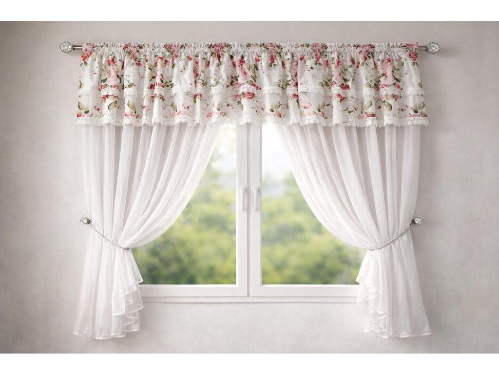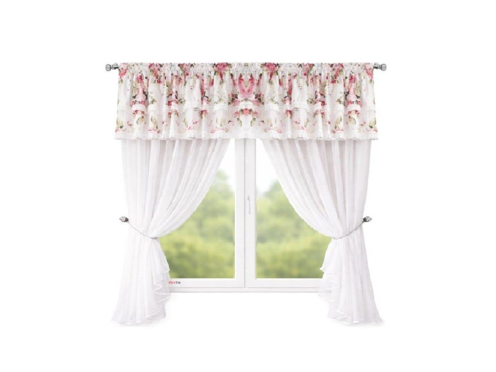 Hotová kusová záclona z hladkého průsvitného bílého voálu s krásným a kvalitním saténovým zdobením. Nahoře je opatřena řasící stuhou díky které můžete měnit šířku záclony a Sada hotových záclon Verena je jemná, romantická záclona z poloprůhledné látky, která krásně propouští světlo a zútulní interiér. Horní část zdobí květinový lambrekin se dvěma řadami krajky, boky lze stáhnout přiloženými páskami.