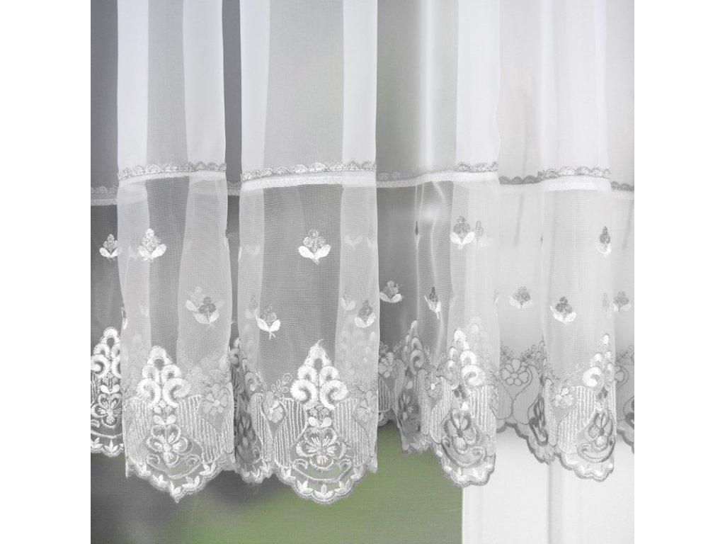 Sada hotových záclon L 595. Nahoře je opatřena řasící stuhou díky které můžete měnit šířku záclony a tunýlkem na tyč o průměru 3,5 cm. Je též přizpůsobena k pověšení na háčky nebo žabky. Záclona je vhodná do každého interiéru ale obzvláště do kuchyně.