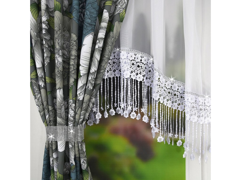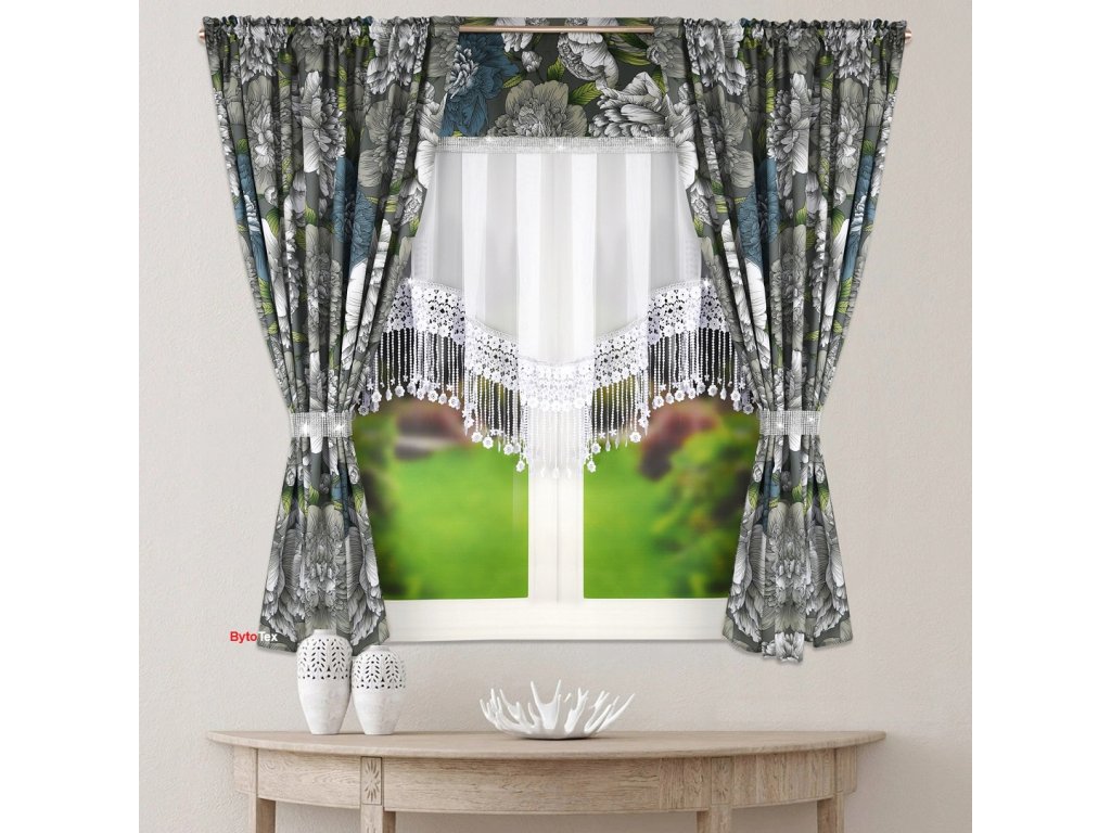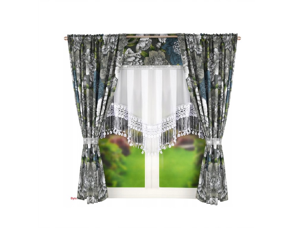 Dekorativní sada LG 238 se skládá ze tří částí: dvou závěsů a záclony. Horní část panelu je vyrobena z materiálu typu panama stretch, zatímco dolní část je z hladkého bílého voálu. Celý materiál je zdoben elegantní páskou s cirkony v horní části a krásnou krajkou v dolní části. V horní části záclony je vsazena stahovací páska a tunel pro trubkový garnýž. Tento set se skvěle skládá, je snadno udržovatelný a žehlí se. Efektní vzor na závěsech skvěle oživí jakýkoli prostor a dodá mu nezaměnitelný šarm.