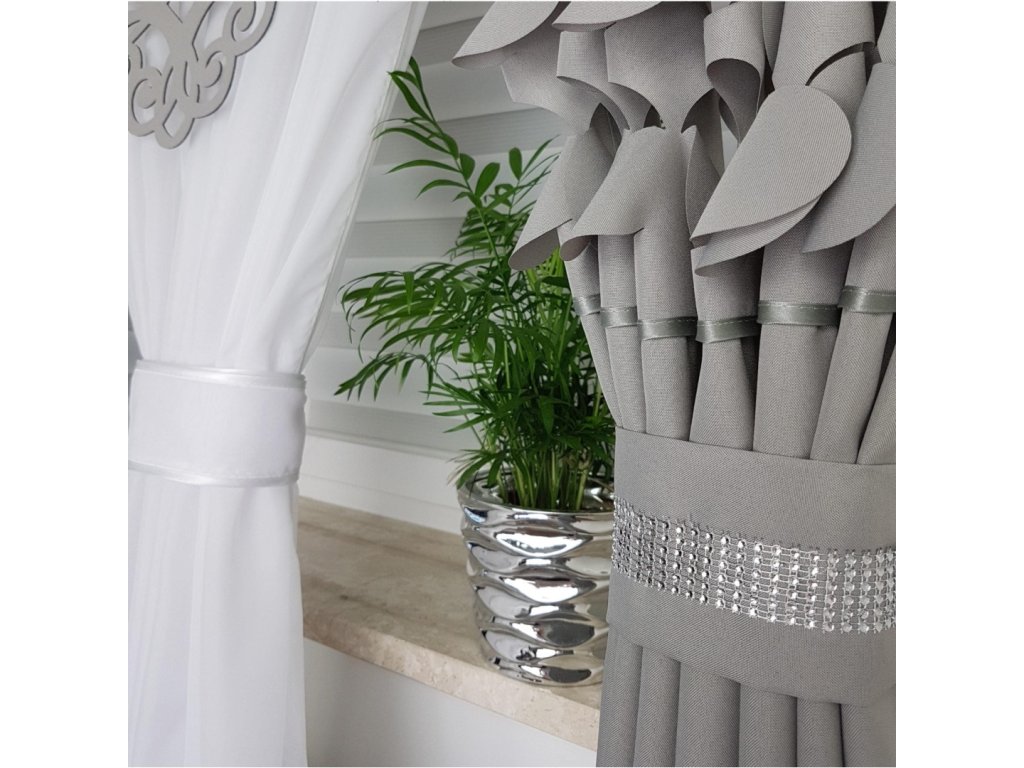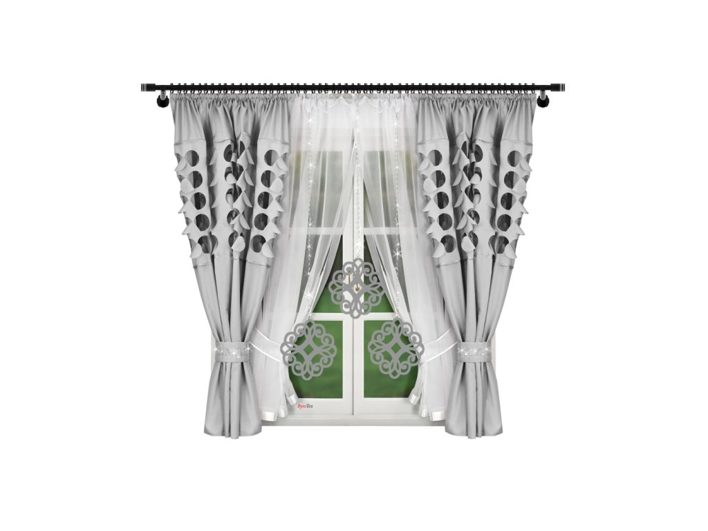 Sada závěsů s bílými voálovými záclonami ozdobenými prolamovanými přívěsky. Dohromady tvoří krásnou dekoraci, která se hodí do dětského pokoje, ale i obývacího pokoje nebo ložnice. Sada LILA je dostupná v různých barvách. Sada se skládá ze tří částí: záclony a dvou závěsů. Pověšením na záclonovou tyč již nebudou potřeba žádné další dekorace.