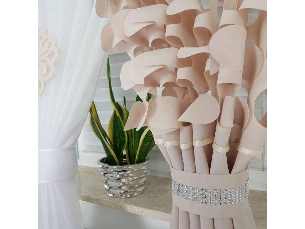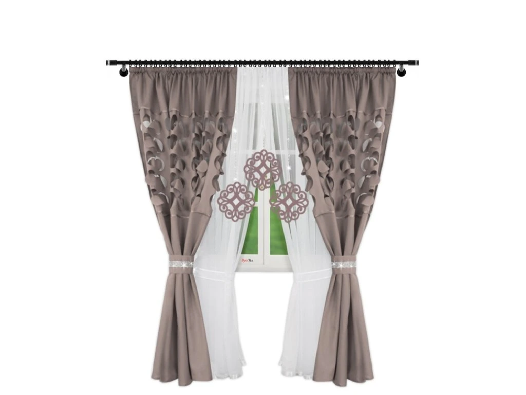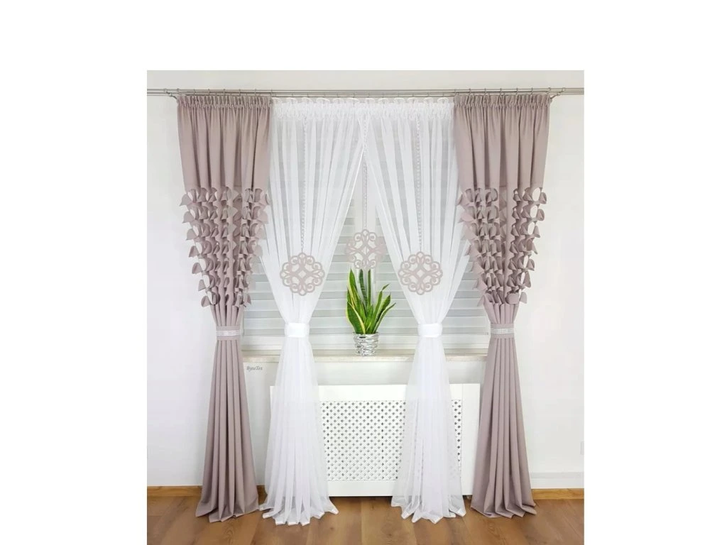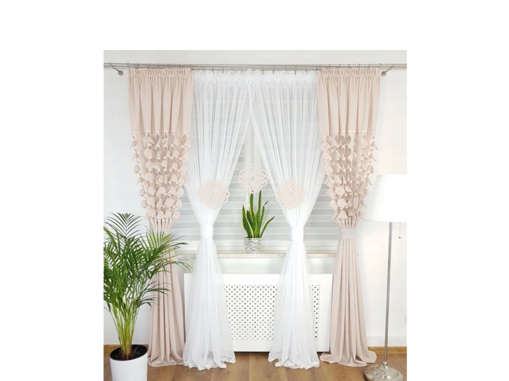 Sada závěsů s bílými voálovými záclonami ozdobenými prolamovanými přívěsky. Dohromady tvoří krásnou dekoraci, která se hodí do dětského pokoje, ale i obývacího pokoje nebo ložnice. Sada LILA je dostupná v různých barvách. Sada se skládá ze tří částí: záclony a dvou závěsů. Pověšením na záclonovou tyč již nebudou potřeba žádné další dekorace.