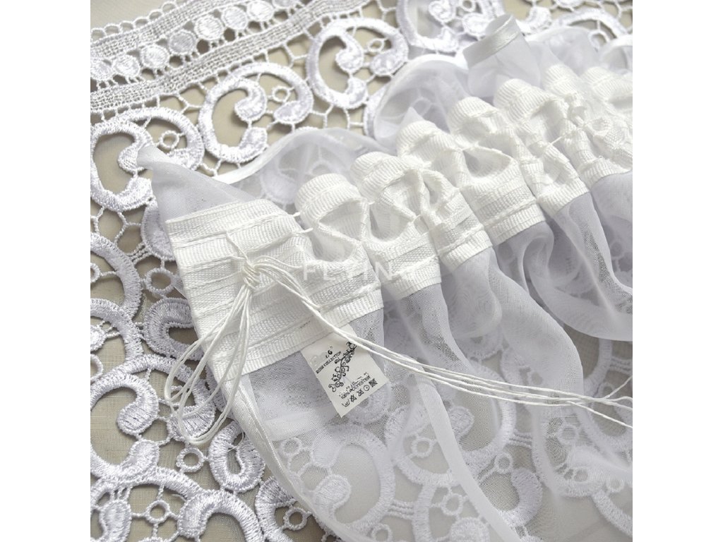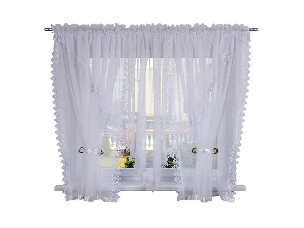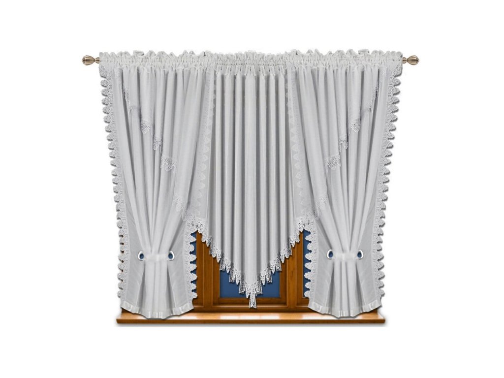 Hotová kusová záclona z hladkého průsvitného bílého voálu je ozdobená krásnou krajkou. Skládá se ze tří dílů které jsou ušité na jedné řasící pásce, má dva otvory opatřené luversy cca 30 cm, které snadno uchytíte sponou na suchý zip. Nahoře je opatřena řasící stuhou díky které můžete měnit šířku záclony a tunýlkem na tyč o průměru 3,5 cm. Je též přizpůsobena k pověšení na háčky nebo žabky.