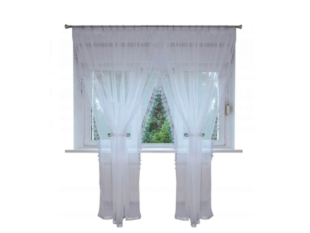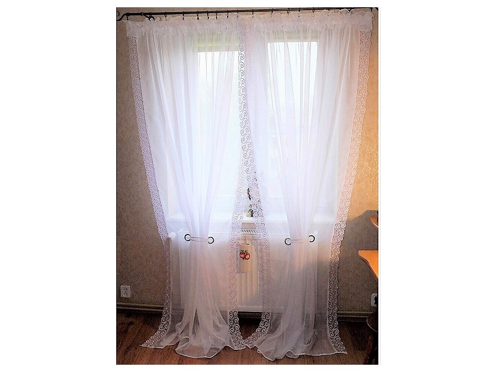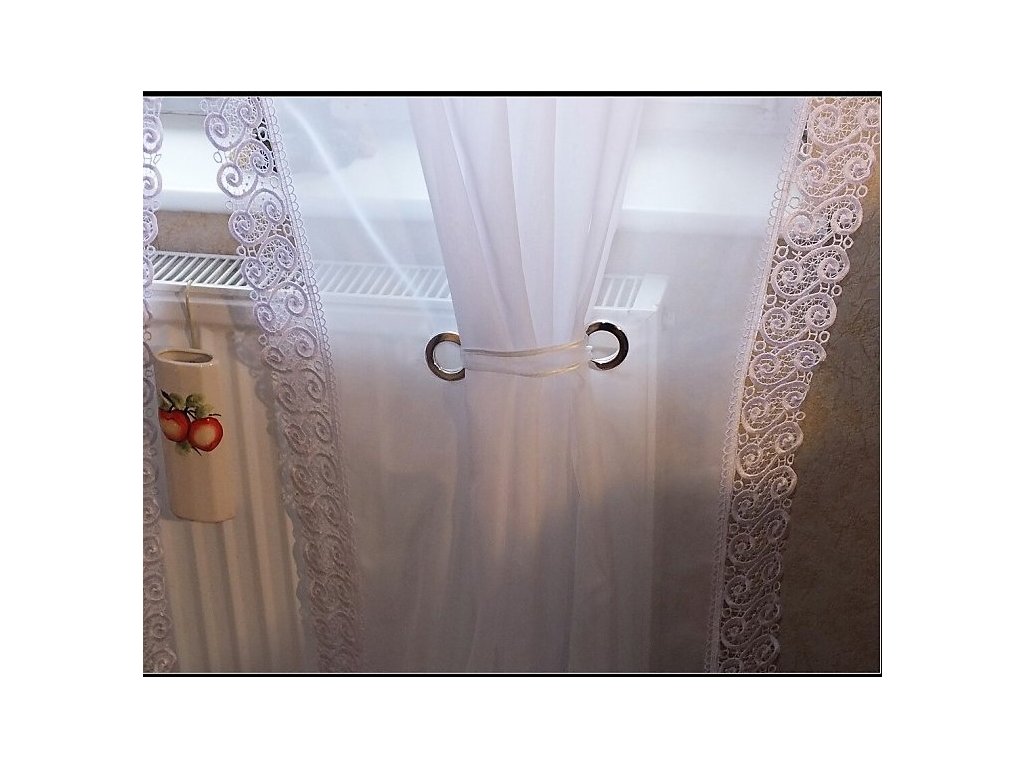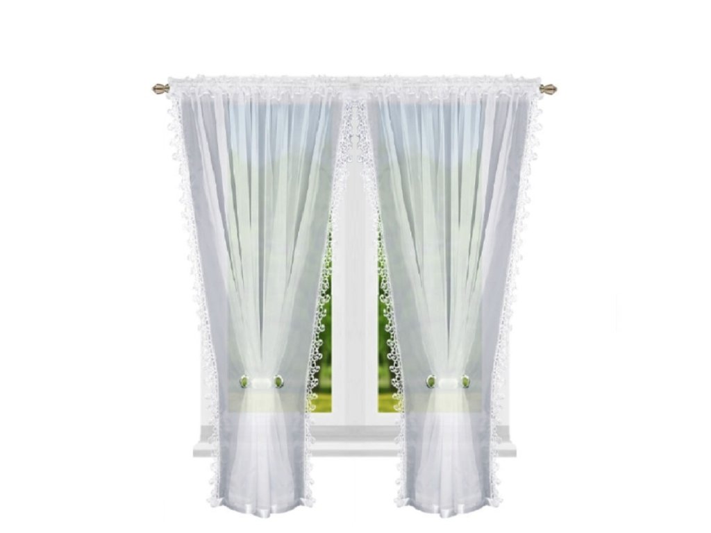 Hotová kusová záclona z hladkého průsvitného bílého voálu je ozdobená krásnou krajkou. Nahoře je opatřena řasící stuhou díky které můžete měnit šířku záclony a tunýlkem na tyč o průměru 3,5 cm. Je též přizpůsobena k pověšení na háčky nebo žabky. Díly mají dva otvory opatřené luversy cca 30 cm, které snadno uchytíte sponou na suchý zip. Krajka ne vždy odpovídá profilovému foto.